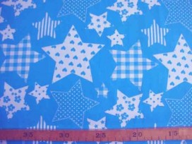 Aqua kleurige boerenbont ruiten, stippen, sterren en hartjes stoffen. Al deze stoffen zijn te combineren. Met bijpassende effen aqua stof.