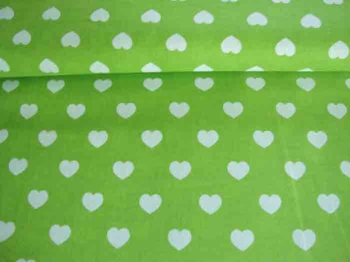 Limekleurige katoen met witte hartjes met een doorsnee van 18 mm.