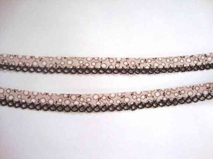 Biaisband zand met een donkerbruine ruche en witte besjes.