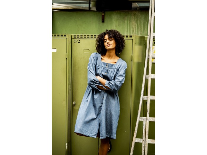 Chambray. Een jeansblauwe denim, heel geschikt voor o.a. jurkjes