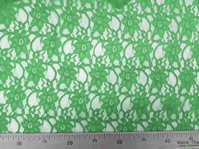 Jacquard kant stof effen groen met bloemenstiksel wat erop ligt.