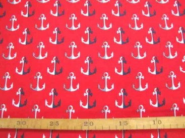 Rode katoen met blauw/wit grijze ankertjes.