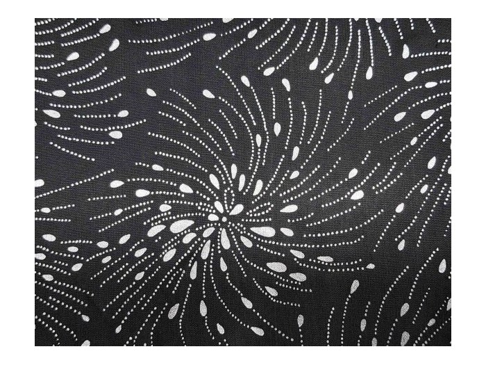 Dunne, soepelvallende zwarte stretch satijn met zilverkleurig vuurwerkpatroon