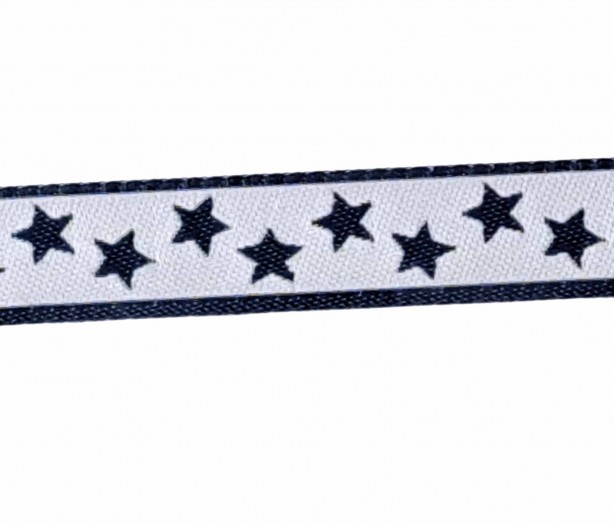 Sierband met blauwe sterretjes en blauwe randen op een witte achtergrond.
