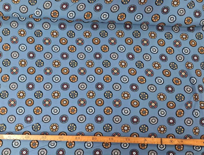Een jeansblauwe tricot met een vikingschild print. Rekt in de breedte en in de lengte. Huidvriendelijk, milieuvriendelijk en kindvriendelijk geproduceerd.