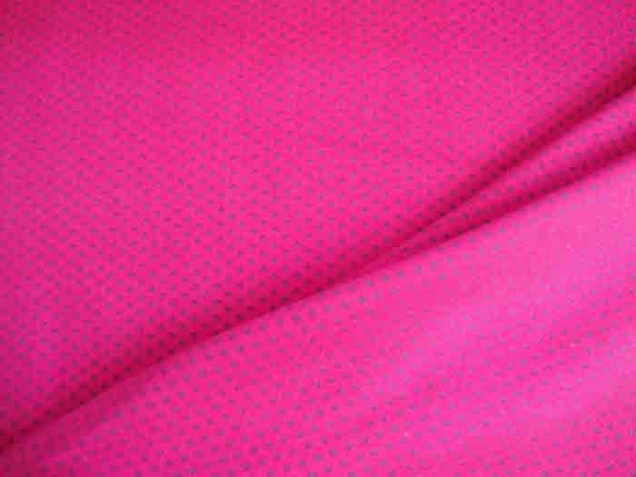 Een pinkkleurige tricot met mini grijze stippen. Rekt zowel in de breedte als in de lengte.