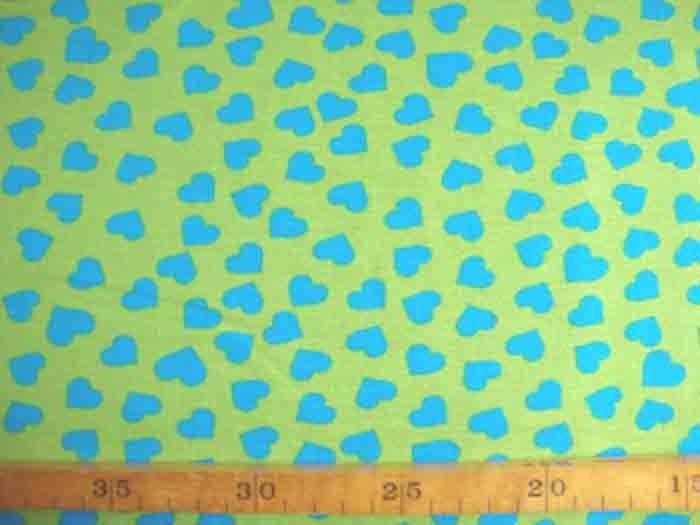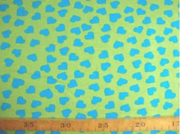 Een limekleurige tricot met aquakleurige hartjes. Rekt zowel in de breedte als in de lengte.