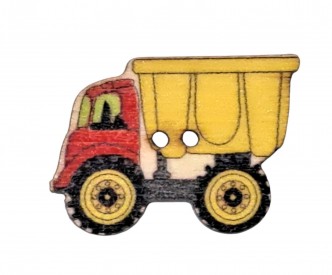 Houten knoop van een gele vrachtwagen met rode cabine.
